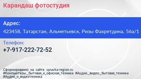 Карандаш, фотостудия по адресу 423458, Татарстан, Альметьевск, Ризы Фахретдина, 56а/1 в дальнейшем Организация, размещена в следующих категориях: