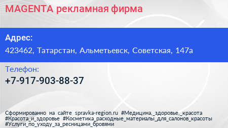 MAGENTA, рекламная фирма по адресу 423462, Татарстан, Альметьевск, Советская, 147а в дальнейшем Организация, размещена в следующих категориях: