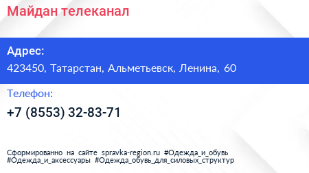 Майдан, телеканал по адресу 423450, Татарстан, Альметьевск, Ленина, 60 в дальнейшем Организация, размещена в следующих категориях: