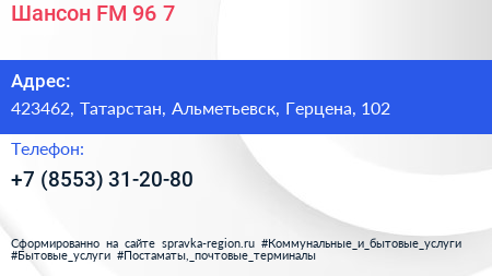 Шансон, FM 96.7 по адресу 423462, Татарстан, Альметьевск, Герцена, 102 в дальнейшем Организация, размещена в следующих категориях: