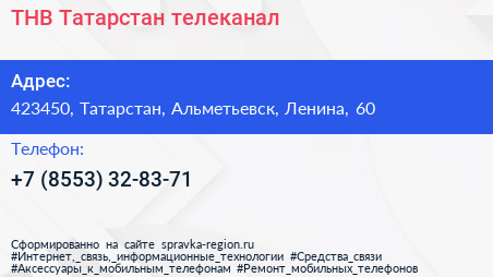 ТНВ-Татарстан, телеканал по адресу 423450, Татарстан, Альметьевск, Ленина, 60 в дальнейшем Организация, размещена в следующих категориях: