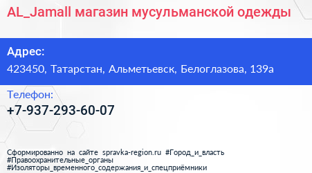 AL_Jamall, магазин мусульманской одежды по адресу 423450, Татарстан, Альметьевск, Белоглазова, 139а в дальнейшем Организация, размещена в следующих категориях: