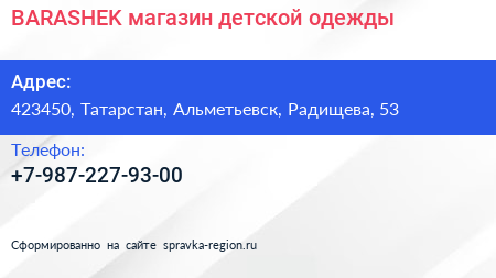 BARASHEK, магазин детской одежды по адресу 423450, Татарстан, Альметьевск, Радищева, 53 в дальнейшем Организация, размещена в следующих категориях: