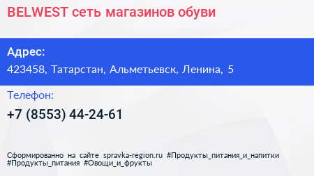 BELWEST, сеть магазинов обуви по адресу 423458, Татарстан, Альметьевск, Ленина, 5 в дальнейшем Организация, размещена в следующих категориях: