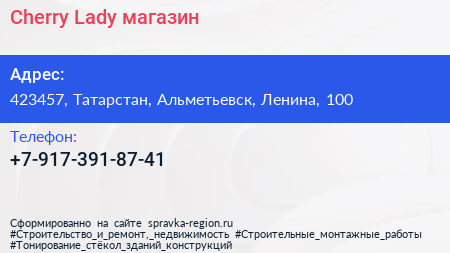 Cherry Lady, магазин по адресу 423457, Татарстан, Альметьевск, Ленина, 100 в дальнейшем Организация, размещена в следующих категориях: