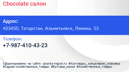 Chocolate, салон по адресу 423450, Татарстан, Альметьевск, Ленина, 53 в дальнейшем Организация, размещена в следующих категориях: