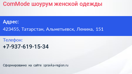 ComMode, шоурум женской одежды по адресу 423455, Татарстан, Альметьевск, Ленина, 151 в дальнейшем Организация, размещена в следующих категориях: