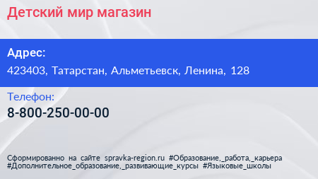 Детский мир, магазин по адресу 423403, Татарстан, Альметьевск, Ленина, 128 в дальнейшем Организация, размещена в следующих категориях: