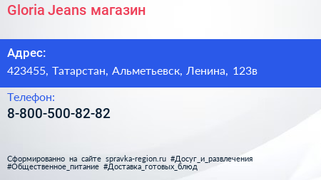 Gloria Jeans, магазин по адресу 423455, Татарстан, Альметьевск, Ленина, 123в в дальнейшем Организация, размещена в следующих категориях: