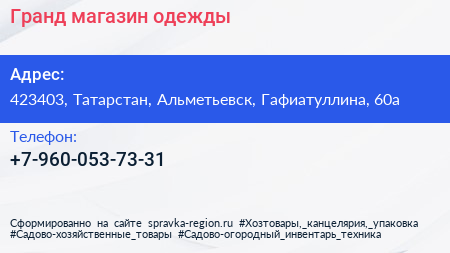 Гранд, магазин одежды по адресу 423403, Татарстан, Альметьевск, Гафиатуллина, 60а в дальнейшем Организация, размещена в следующих категориях:
