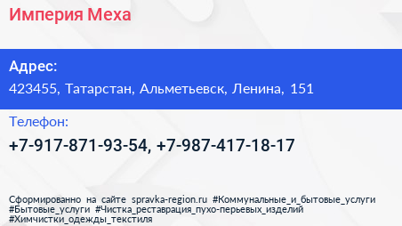 Империя Меха по адресу 423455, Татарстан, Альметьевск, Ленина, 151 в дальнейшем Организация, размещена в следующих категориях: