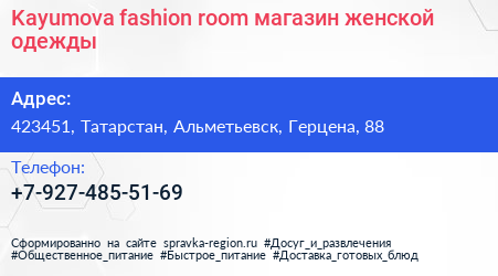 Kayumova fashion room, магазин женской одежды по адресу 423451, Татарстан, Альметьевск, Герцена, 88 в дальнейшем Организация, размещена в следующих категориях: