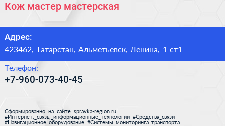 Кож мастер, мастерская по адресу 423462, Татарстан, Альметьевск, Ленина, 1 ст1 в дальнейшем Организация, размещена в следующих категориях: