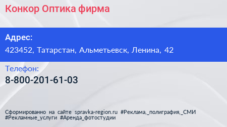Конкор-Оптика, фирма по адресу 423452, Татарстан, Альметьевск, Ленина, 42 в дальнейшем Организация, размещена в следующих категориях: