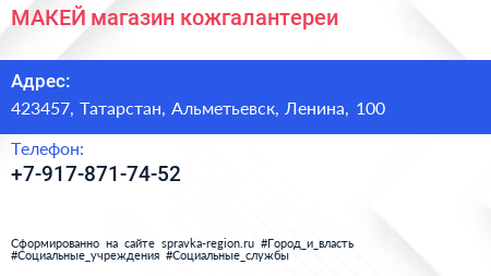 МАКЕЙ, магазин кожгалантереи по адресу 423457, Татарстан, Альметьевск, Ленина, 100 в дальнейшем Организация, размещена в следующих категориях: