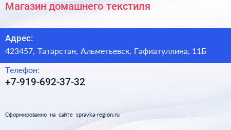 Магазин домашнего текстиля по адресу 423457, Татарстан, Альметьевск, Гафиатуллина, 11Б в дальнейшем Организация, размещена в следующих категориях:
