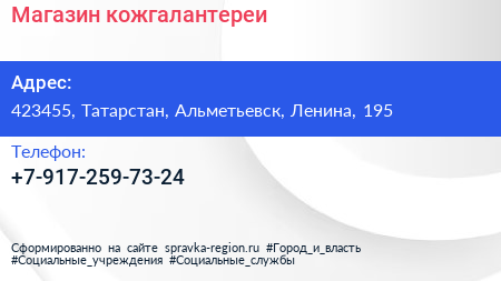 Магазин кожгалантереи по адресу 423455, Татарстан, Альметьевск, Ленина, 195 в дальнейшем Организация, размещена в следующих категориях: