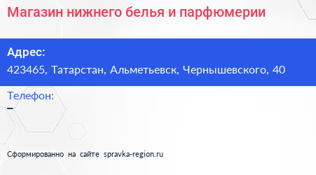 Магазин нижнего белья и парфюмерии по адресу 423465, Татарстан, Альметьевск, Чернышевского, 40 в дальнейшем Организация, размещена в следующих категориях: