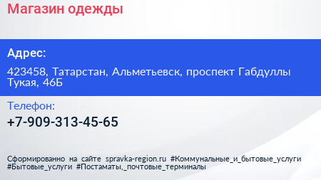Магазин одежды по адресу 423458, Татарстан, Альметьевск, проспект Габдуллы Тукая, 46Б в дальнейшем Организация, размещена в следующих категориях: