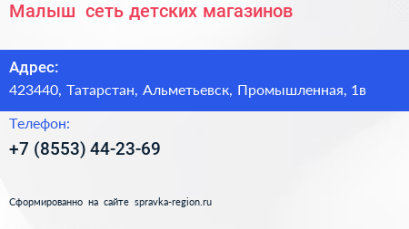Малыш+, сеть детских магазинов по адресу 423440, Татарстан, Альметьевск, Промышленная, 1в в дальнейшем Организация, размещена в следующих категориях: