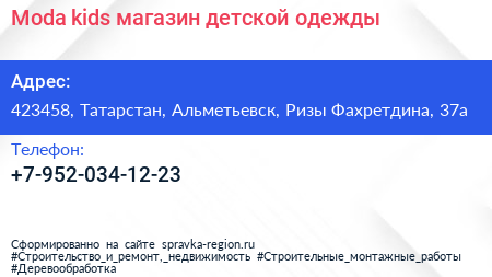 Moda kids, магазин детской одежды по адресу 423458, Татарстан, Альметьевск, Ризы Фахретдина, 37а в дальнейшем Организация, размещена в следующих категориях: