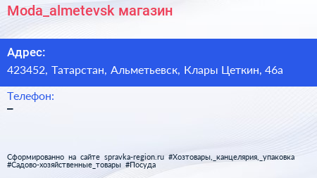 Moda_almetevsk, магазин по адресу 423452, Татарстан, Альметьевск, Клары Цеткин, 46а в дальнейшем Организация, размещена в следующих категориях: