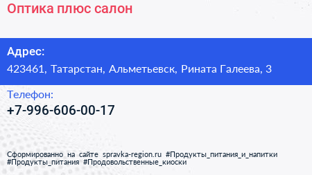Оптика плюс, салон по адресу 423461, Татарстан, Альметьевск, Рината Галеева, 3 в дальнейшем Организация, размещена в следующих категориях: