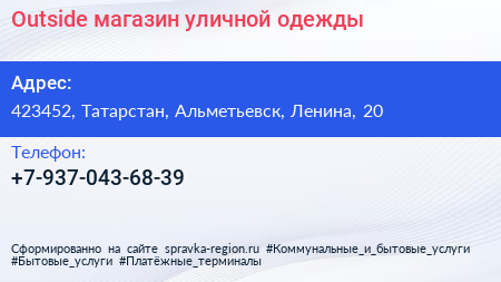 Outside, магазин уличной одежды по адресу 423452, Татарстан, Альметьевск, Ленина, 20 в дальнейшем Организация, размещена в следующих категориях: