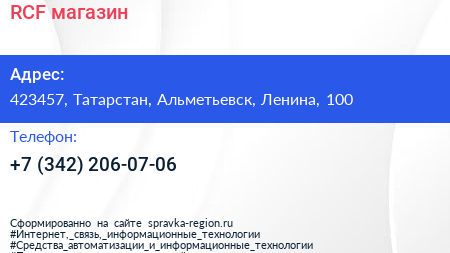 RCF, магазин по адресу 423457, Татарстан, Альметьевск, Ленина, 100 в дальнейшем Организация, размещена в следующих категориях:
