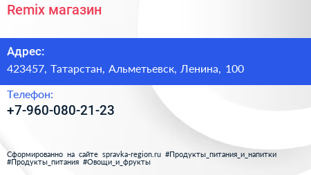 Remix, магазин по адресу 423457, Татарстан, Альметьевск, Ленина, 100 в дальнейшем Организация, размещена в следующих категориях: