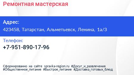 Ремонтная мастерская по адресу 423458, Татарстан, Альметьевск, Ленина, 1а/3 в дальнейшем Организация, размещена в следующих категориях: