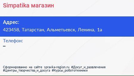 Simpatika, магазин по адресу 423458, Татарстан, Альметьевск, Ленина, 1а в дальнейшем Организация, размещена в следующих категориях: