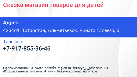 Сказка, магазин товаров для детей по адресу 423461, Татарстан, Альметьевск, Рината Галеева, 3 в дальнейшем Организация, размещена в следующих категориях: