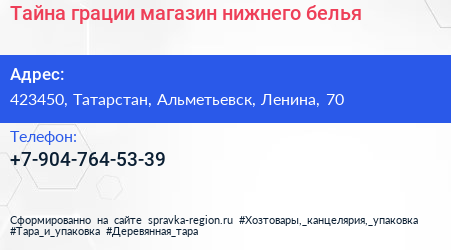 Тайна грации, магазин нижнего белья по адресу 423450, Татарстан, Альметьевск, Ленина, 70 в дальнейшем Организация, размещена в следующих категориях: