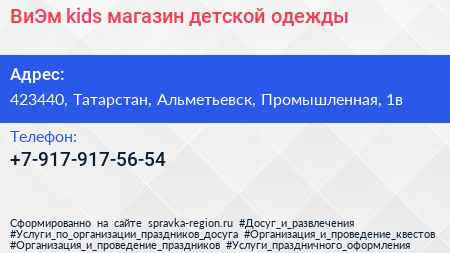ВиЭм kids, магазин детской одежды по адресу 423440, Татарстан, Альметьевск, Промышленная, 1в в дальнейшем Организация, размещена в следующих категориях:
