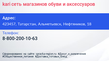 kari, сеть магазинов обуви и аксессуаров по адресу 423457, Татарстан, Альметьевск, Нефтяников, 18 в дальнейшем Организация, размещена в следующих категориях: