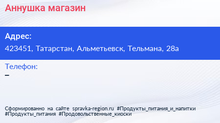 Аннушка, магазин по адресу 423451, Татарстан, Альметьевск, Тельмана, 28а в дальнейшем Организация, размещена в следующих категориях: