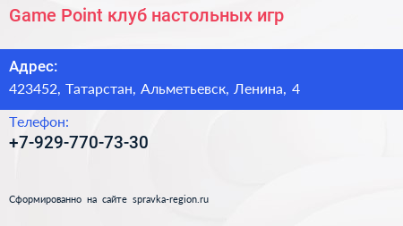 Game Point, клуб настольных игр по адресу 423452, Татарстан, Альметьевск, Ленина, 4 в дальнейшем Организация, размещена в следующих категориях: