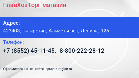 ГлавХозТорг, магазин по адресу 423403, Татарстан, Альметьевск, Ленина, 126 в дальнейшем Организация, размещена в следующих категориях: