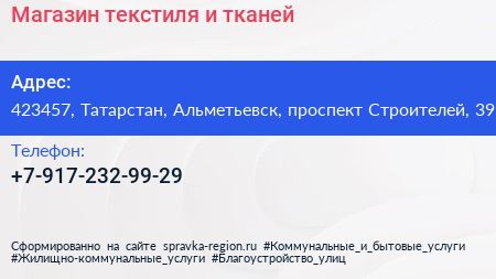 Магазин текстиля и тканей по адресу 423457, Татарстан, Альметьевск, проспект Строителей, 39 в дальнейшем Организация, размещена в следующих категориях: