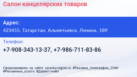 Салон канцелярских товаров по адресу 423455, Татарстан, Альметьевск, Ленина, 189 в дальнейшем Организация, размещена в следующих категориях: