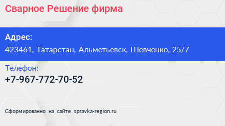 Сварное Решение, фирма по адресу 423461, Татарстан, Альметьевск, Шевченко, 25/7 в дальнейшем Организация, размещена в следующих категориях: