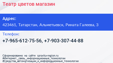 Театр цветов, магазин по адресу 423461, Татарстан, Альметьевск, Рината Галеева, 3 в дальнейшем Организация, размещена в следующих категориях: