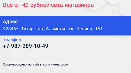 Всё от 40 рублей, сеть магазинов по адресу 423455, Татарстан, Альметьевск, Ленина, 151 в дальнейшем Организация, размещена в следующих категориях: