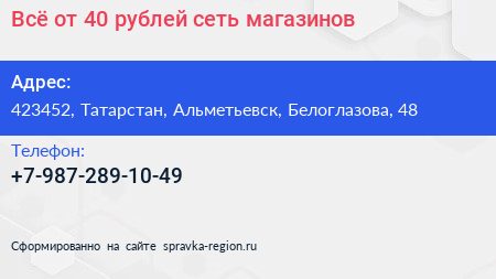 Всё от 40 рублей, сеть магазинов по адресу 423452, Татарстан, Альметьевск, Белоглазова, 48 в дальнейшем Организация, размещена в следующих категориях: