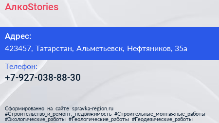 АлкоStories по адресу 423457, Татарстан, Альметьевск, Нефтяников, 35а в дальнейшем Организация, размещена в следующих категориях: