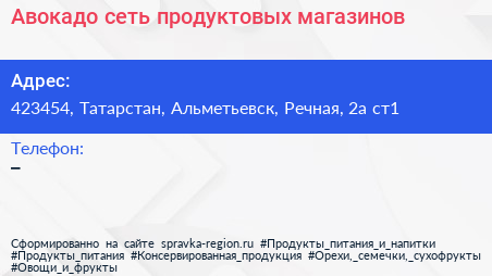 Авокадо, сеть продуктовых магазинов по адресу 423454, Татарстан, Альметьевск, Речная, 2а ст1 в дальнейшем Организация, размещена в следующих категориях: