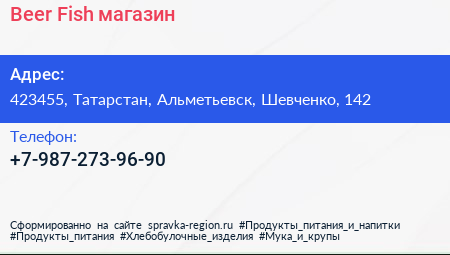 Beer & Fish, магазин по адресу 423455, Татарстан, Альметьевск, Шевченко, 142 в дальнейшем Организация, размещена в следующих категориях: