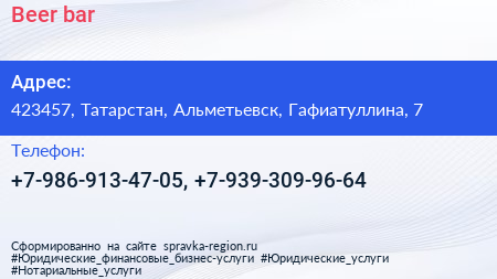 Beer bar по адресу 423457, Татарстан, Альметьевск, Гафиатуллина, 7 в дальнейшем Организация, размещена в следующих категориях: