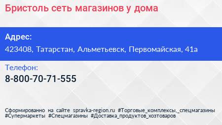 Бристоль, сеть магазинов у дома по адресу 423408, Татарстан, Альметьевск, Первомайская, 41а в дальнейшем Организация, размещена в следующих категориях: